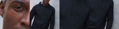 Brushed back fleece. Drop shoulder style. Regular fit. Three panel hood. Self colour drawcord with metal tips. V detail at front neck.