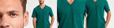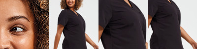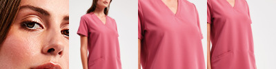 Breathable four-way stretch fabric. Durable, crease resistant and easy care. Modern fit. V neck. Left chest pocket. Back darts. Side vents.
