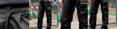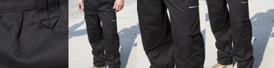 Windproof and breathable. Expandable waistband with belt loops. Zip fly with button over. Cargo pockets on both legs with reflective trim. Rear pockets. Hammer loop.