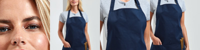 Three pocket short bib apron. Self fabric neck tie with adjusting buckle. Doubled over neck ties are folded to form waist apron. Self fabric 90cm ties. Width 60cm. Length 62cm.