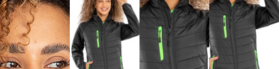 Recycled polyester outer. Polyester padding and lining. Repreve® recycled padding. Polyester micro fleece inner layer. Two layer mechanical stretch printable soft shell sleeves. Lightweight. Showerproof and windproof. Hang tag. Full length zip with chin guard and inner zip guard. Contrast right chest zip pocket and two front zip pockets. Soft bound cuffs. Open hem. Tag free. Access for decoration.
