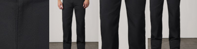 Traditional waistband with belt loops. Concealed zip fly with button over. Two side swing pockets. One rear open pocket. WRAP Certified Production.