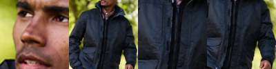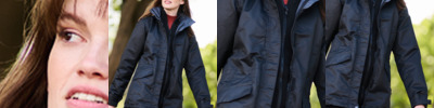 - Full length two way zip with stud and tear release storm flap