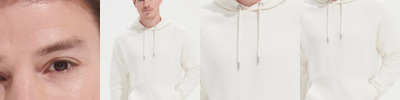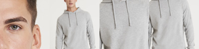 Soft cotton faced fabric. Drop shoulder style. Double fabric hood. No drawcords to comply with EU regulations. Front pouch pocket with opening for ear phone cord feed. Ribbed cuffs and hem.
